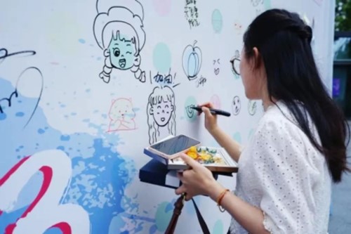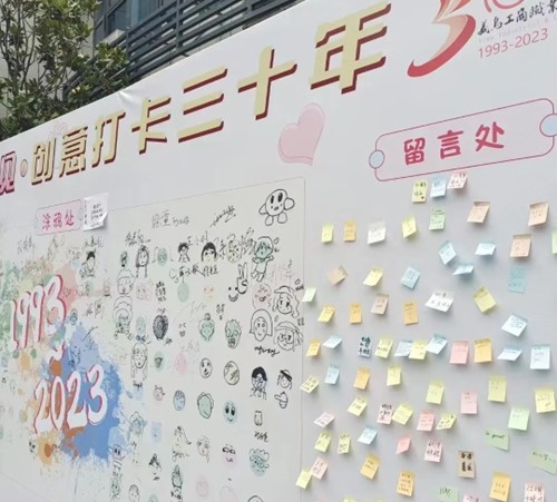 “感恩遇见.创意打卡三十年”,在背景板上分为两块区域,分别是涂鸦区和留言区。大家通过自己的喜好在涂鸦区上留下可爱的人物小漫画,也许是自己也许是家人也许是爱的人,千言万语汇成一句感恩遇见,也可以在留言区留下对学校的祝福。