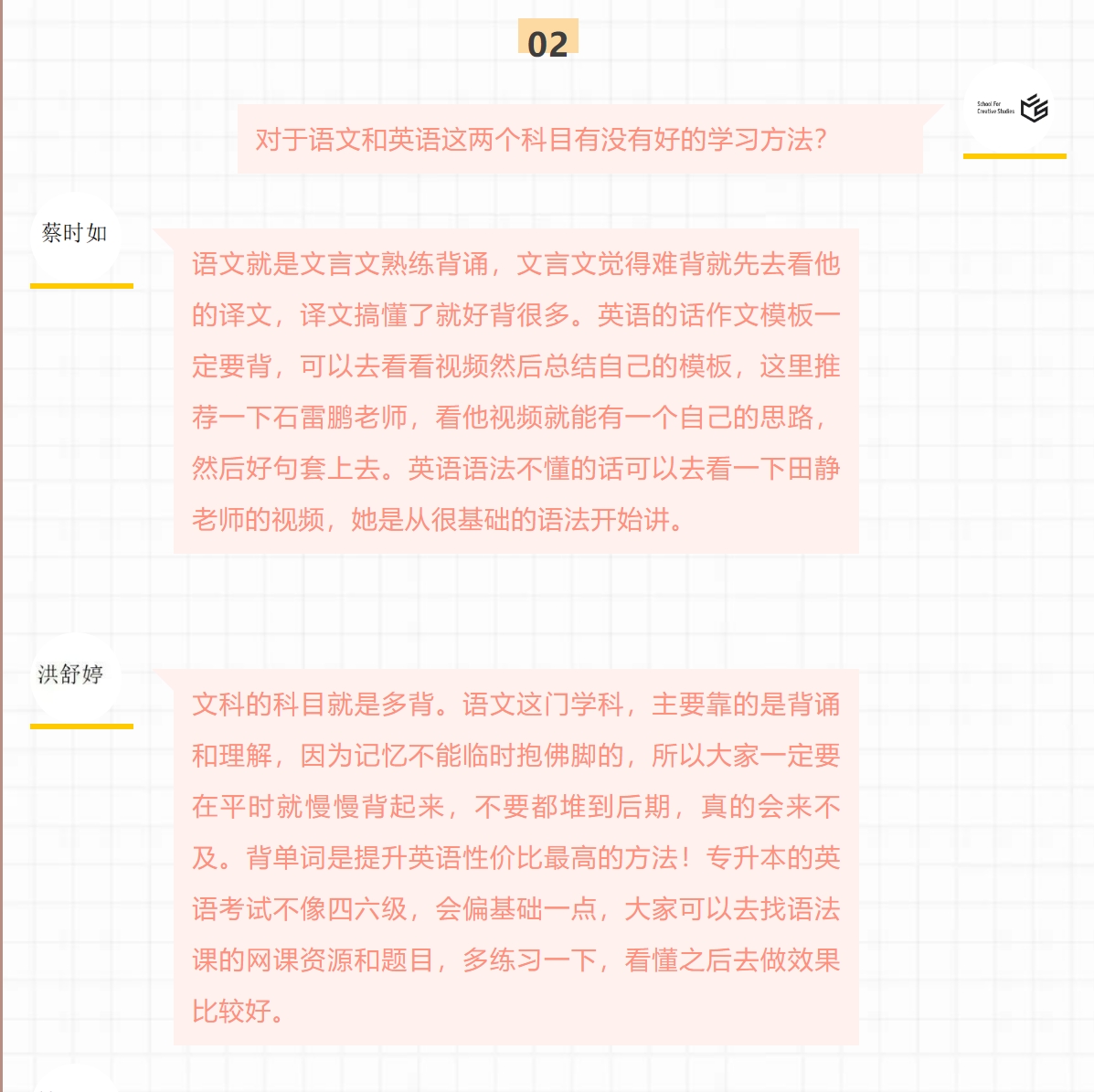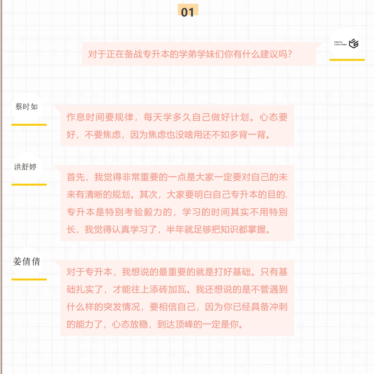 日迈月征,朝暮轮转,希望你我总对下一轮日月充满期待,努力向前奔跑,星辰皆在身后同行!下面让我们有请已经成功上岸的学长学姐为我们分享专升本学习经验,和我们讲述他们的“上岸”之途!希望在学姐们的耐心解答下使你对专升本有一定的了解。