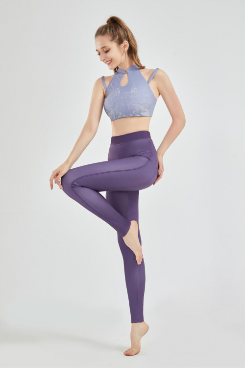 本系列灵感来源于东方文化之旗袍与白描画元素,上装旗袍领的设计,不仅美观大方,还能有效地避免运动时颈部压力过大,印花采用白描风格,能够给人带来愉悦轻灵感,整体采用紫色,使服装更具时尚感和艺术感。